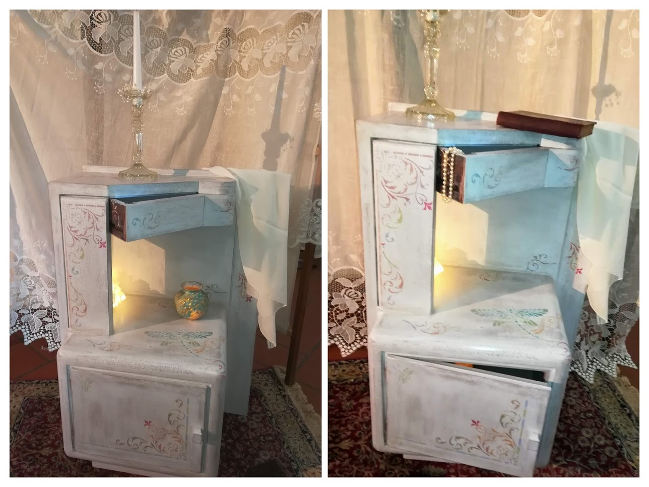 | tavolino très jolie (tecnica mista, parte inferiore shabby e piano superiore con patinatura ad encaustico) |