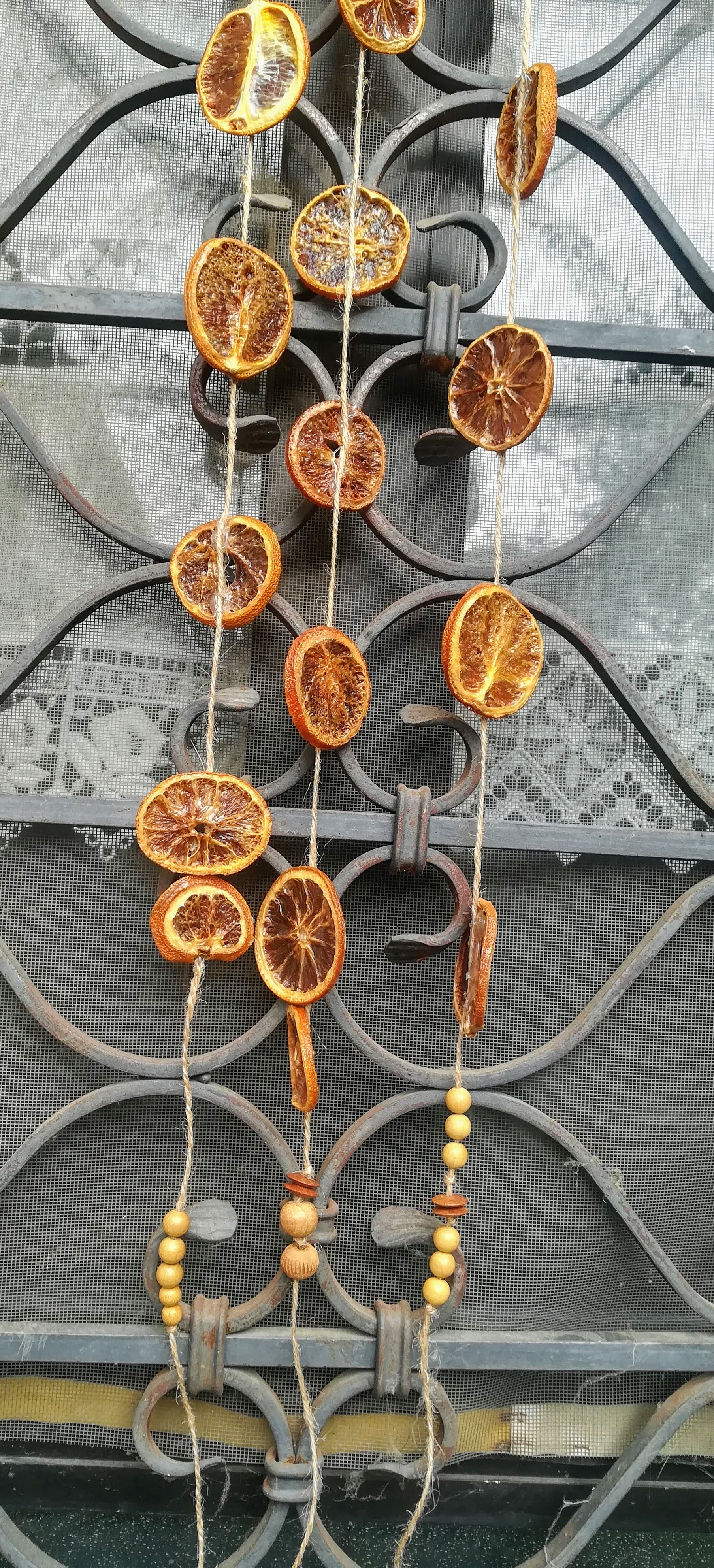 | le collane di arance appese alla finestra per un'atmofera romantica | |