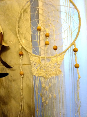 Un acchiappasogni con una decorazione a macramè da regalare all'amica sognatrice e alla quale si vuol donare un pensiero di serenità e armonia. Realizzato con un cerchio di metallo foderato di filo di cotone, con griglia tipica degli acchiappasogni, fili di perle di legno, decoro in macramè, frange e nastri .