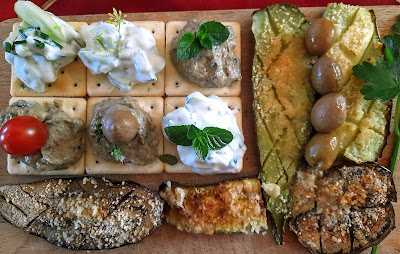 bruschette con salsa di melanzane e tzazichi, frisella con tre salse