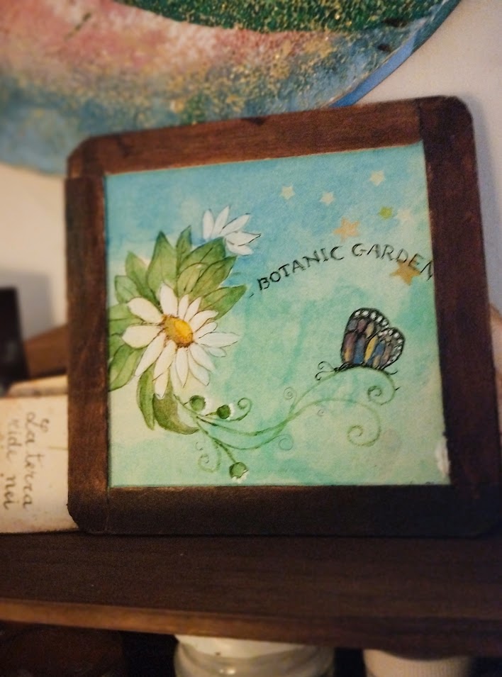 Ecco alcune foto del nostro primo quadretto; forse sarebbe più impattante con una bella cornicetta in stile barocco, ma a noi piace anche così, semplice e rustica che contrasta con la delicatezza dell'acquerello e, soprattutto, fai da te a costo quasi zero.